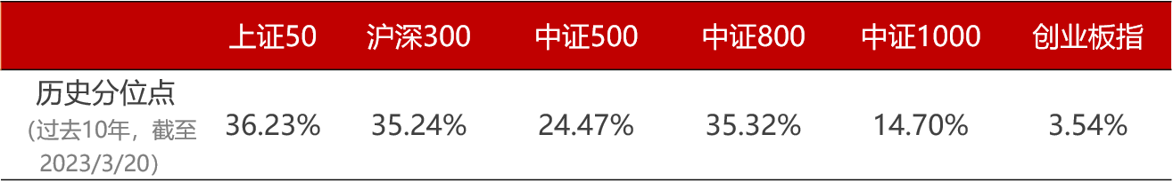 从估值指标来看,上证50、沪深300、中证800指数的估值约处于过去10年的35%左右,而中证500、中证1000的估值分位点更低,创业板指更是仅处于最近10年的3.54%分位点,也就是说创业板指比过去十年里超96%的时间都“便宜”。