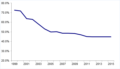 据世界银行测算,养老金替代率不低于70%时,老年人退休前后的生活质量才不会出现明显下降。而现实情况是,在老年抚养比逐年上升的情况下,养老金增速显著低于在岗职工的工资增速,因此基本养老金替代率长期处于下降通道。数据显示,我国基本养老金替代率从2000年的72%降至2015年的45%。
