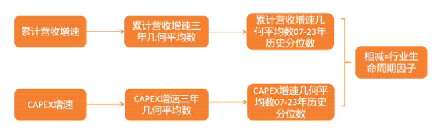 为了使该两项指标更好地反映出行业所处的阶段,我们对数据进行三年几何平均处理,再采用历史分位数方式对数据进行标准化。采用三年几何平均处理是为了消除经济周期(需求端)的影响,更准确地评估行业供给端的变化,而且不被短期数据干扰。为了让不同行业具有可比性,需采取标准化处理,以免因为行业特性不同而出现比较偏差。
