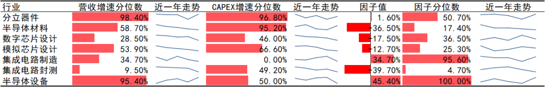 可以看出,电子板块整体因子分位数处于历史中等水平。因子分位数较高的产业有半导体设备与集成电路制造。其中半导体设备营收增速处于历史高位,但资本开支(CAPEX)增速处于历史中等且有下滑趋势,说明该产业目前正在出清阶段。集成电路制造营收分位数不高,但资本开支(CAPEX)增速较低,因此因子值也较高。分立器件的营收增速与资本开支增速均较高,处于扩张阶段。半导体材料、芯片设计产业营收与资本开支均上升,但其资本开支增速分位数高于营收增速分位数。这说明尽管该行业依然处于增长状态,但竞争也在慢慢加剧。