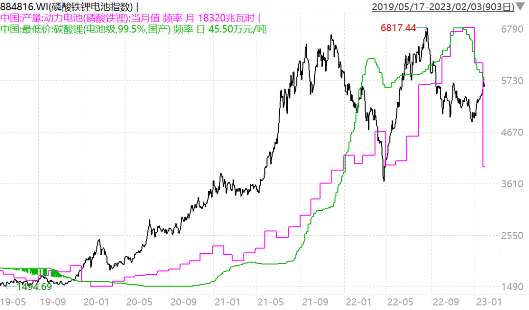 图注:磷酸铁锂板块股价大幅领先于锂价格和磷酸铁锂产量启动和见顶