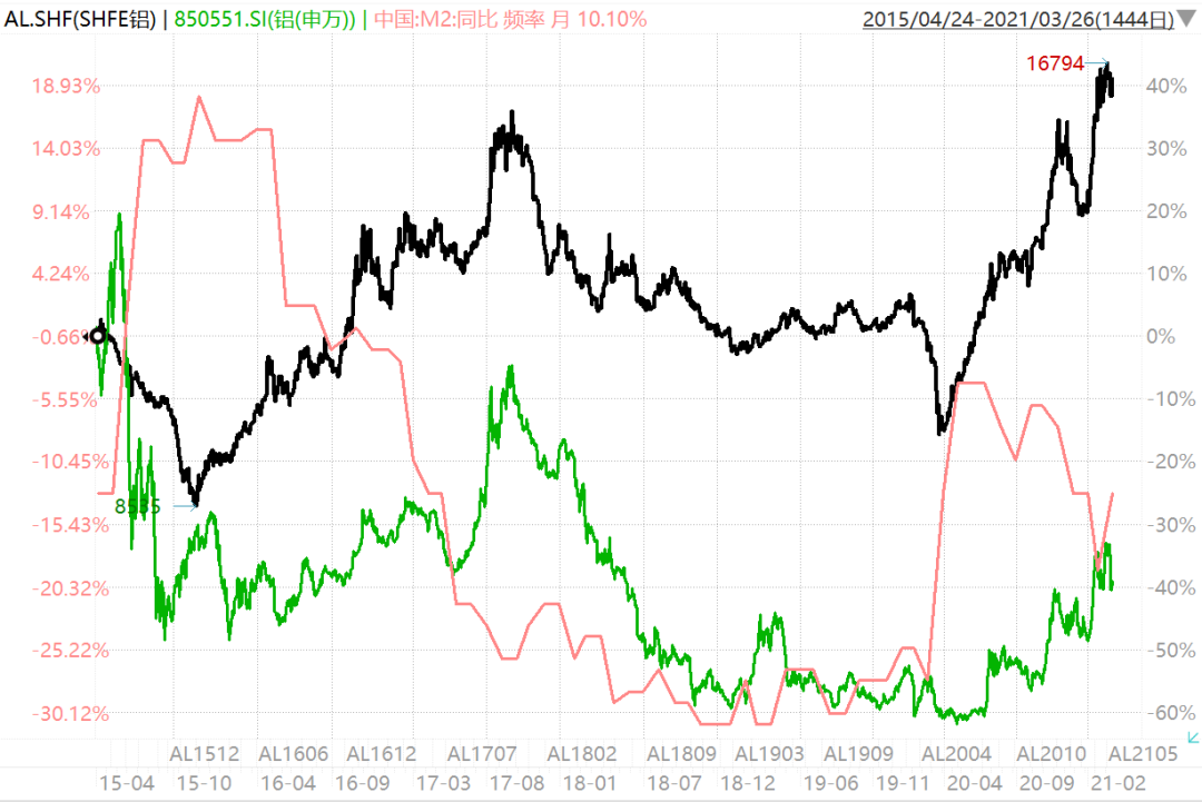 图注:归因后供给侧改革导致的铝价波动只能短期解释铝行业股票的涨跌,而M2则可以领先3个月左右解释铝行业股票的中期趋势