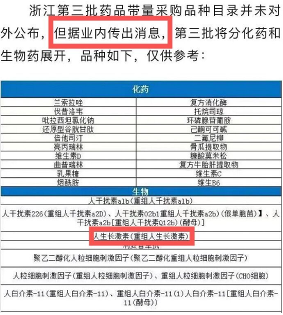 整件事要追溯到2022年8月,当时,一则自媒体发布的浙江省将集采生长激素的传闻在网络上疯狂传播,其中流传甚广的是一张截图,图中给出了浙江省第三批药品集采的品种列表,生长激素赫然在列。图中文字称,列表信息乃是“业内消息”,故而许多投资者不疑有他。